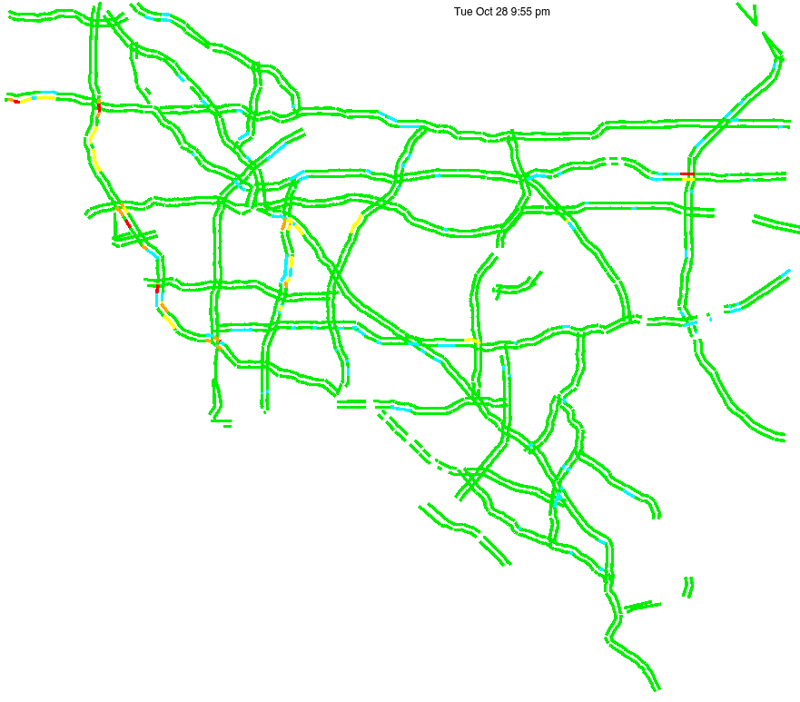 This is a map of historical traffic over 1 hour of time. The colored lines represent speed.