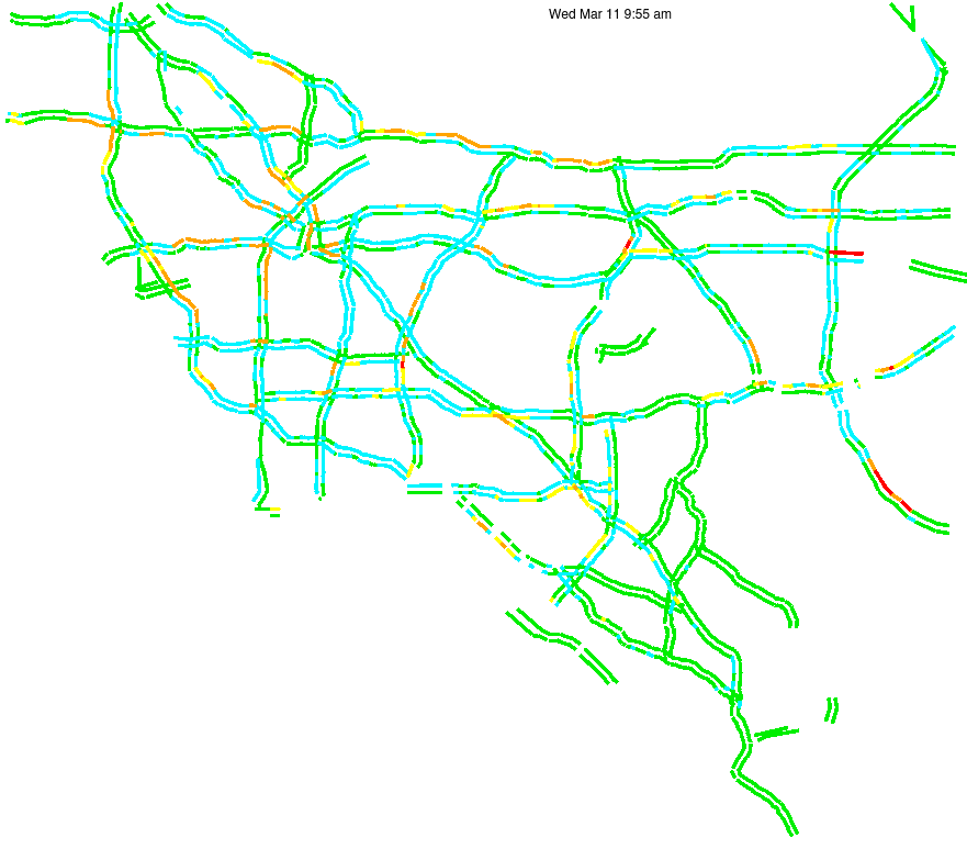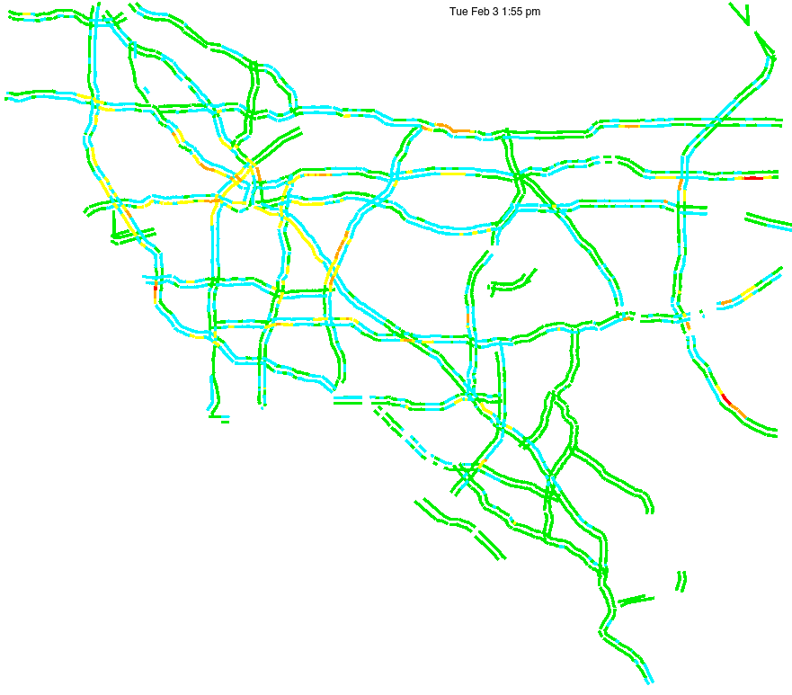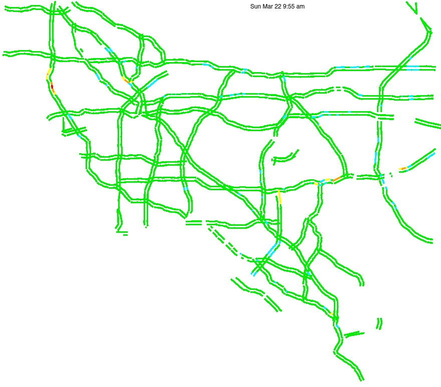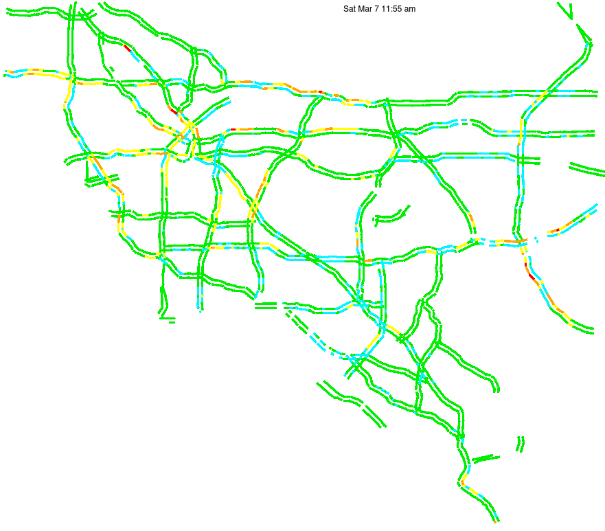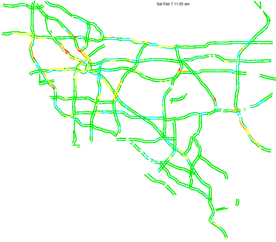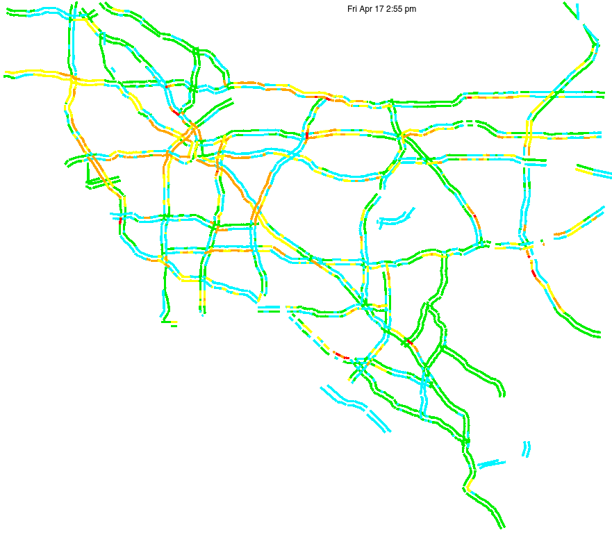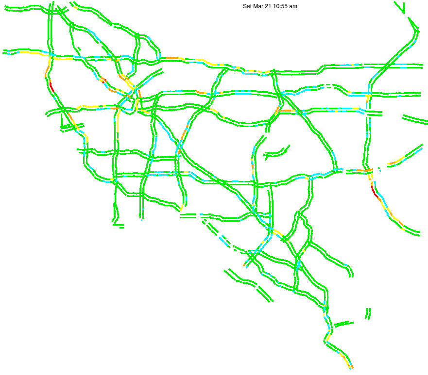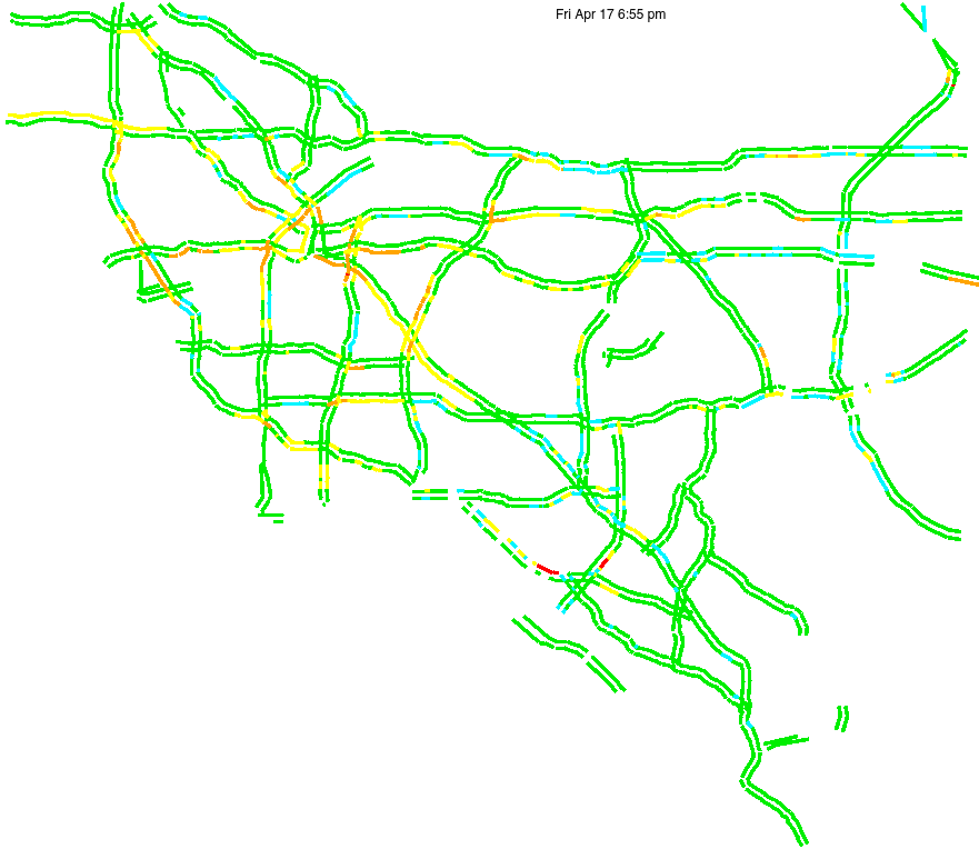 This is a map of historical traffic over 1 hour of time. The colored lines represent speed.