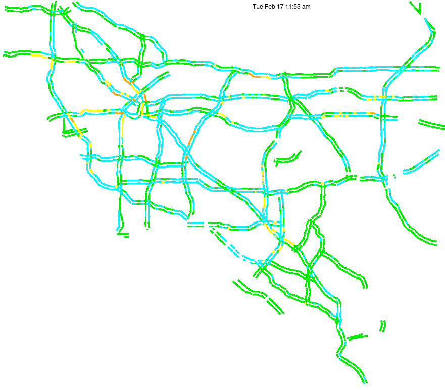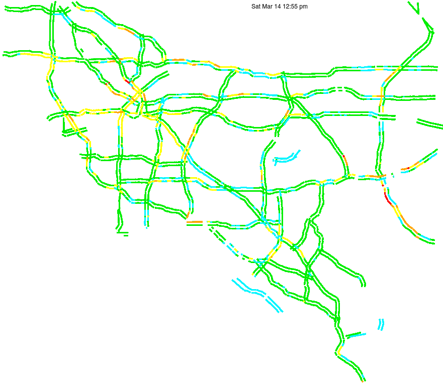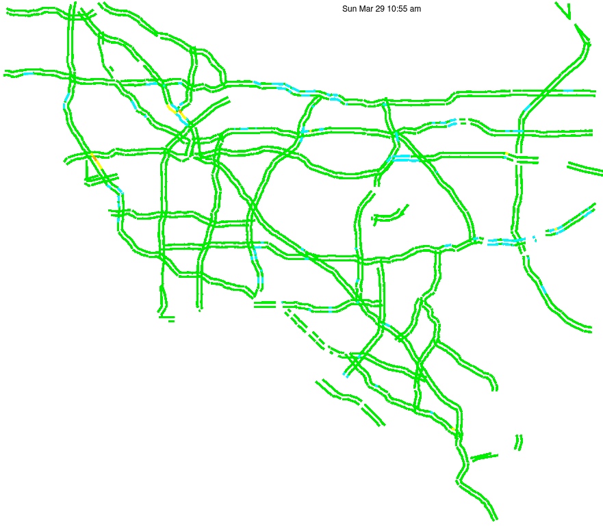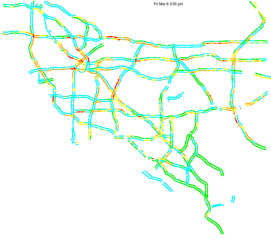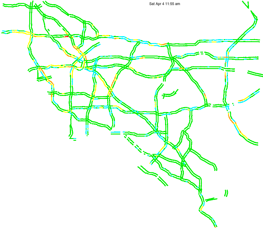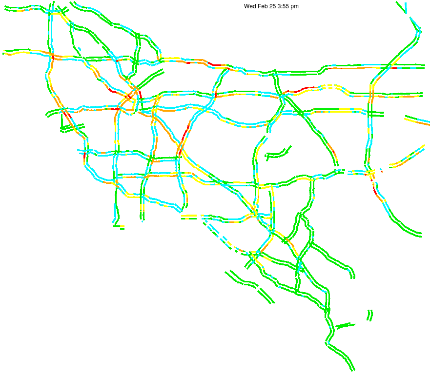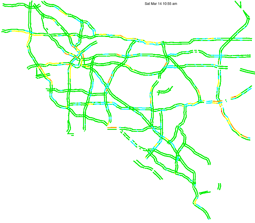 This is a map of historical traffic over 1 hour of time. The colored lines represent speed.
