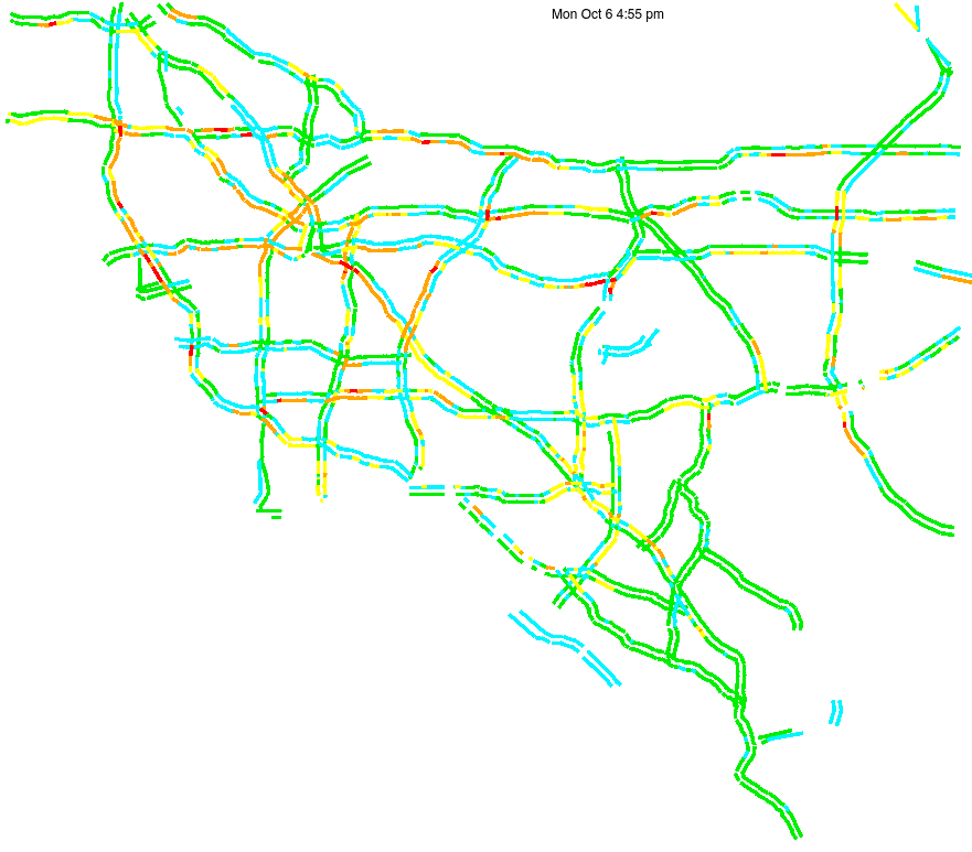 This is a map of historical traffic over 1 hour of time. The colored lines represent speed.