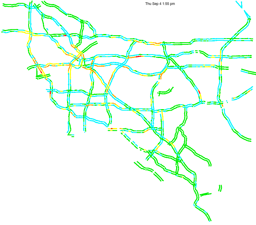 This is a map of historical traffic over 1 hour of time. The colored lines represent speed.