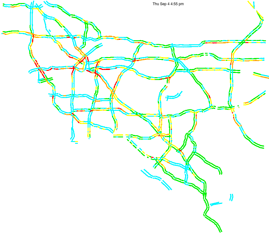 This is a map of historical traffic over 1 hour of time. The colored lines represent speed.