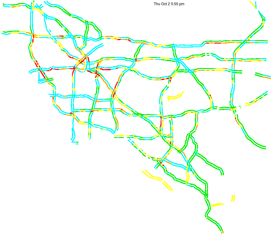 This is a map of historical traffic over 1 hour of time. The colored lines represent speed.