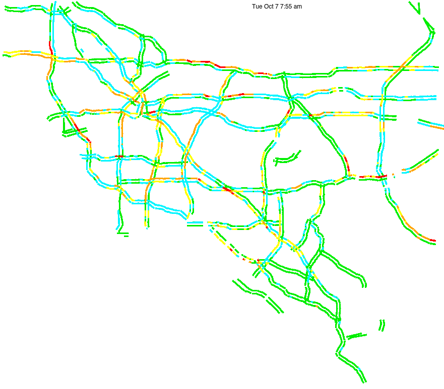 This is a map of historical traffic over 1 hour of time. The colored lines represent speed.