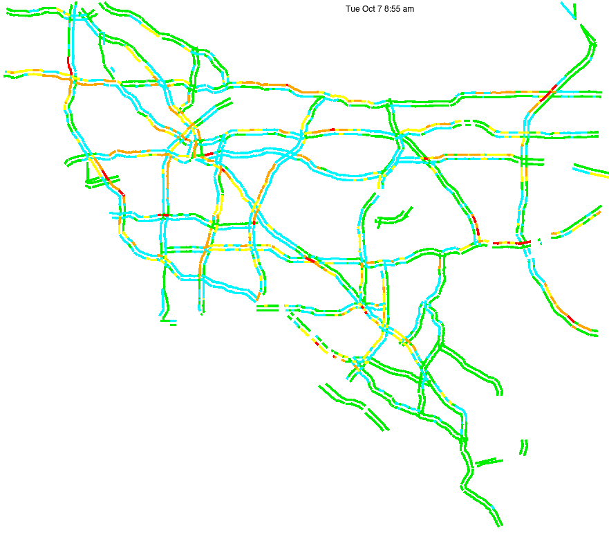This is a map of historical traffic over 1 hour of time. The colored lines represent speed.