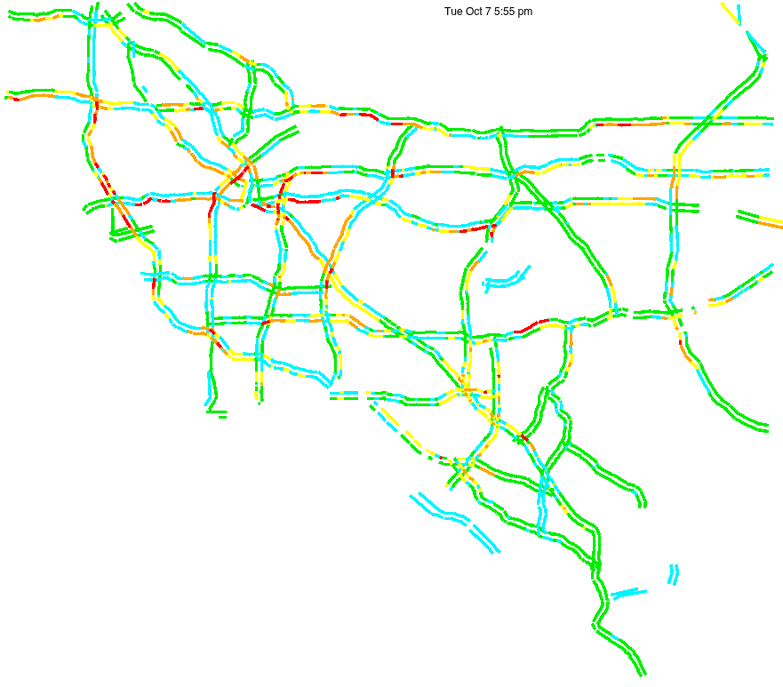 This is a map of historical traffic over 1 hour of time. The colored lines represent speed.