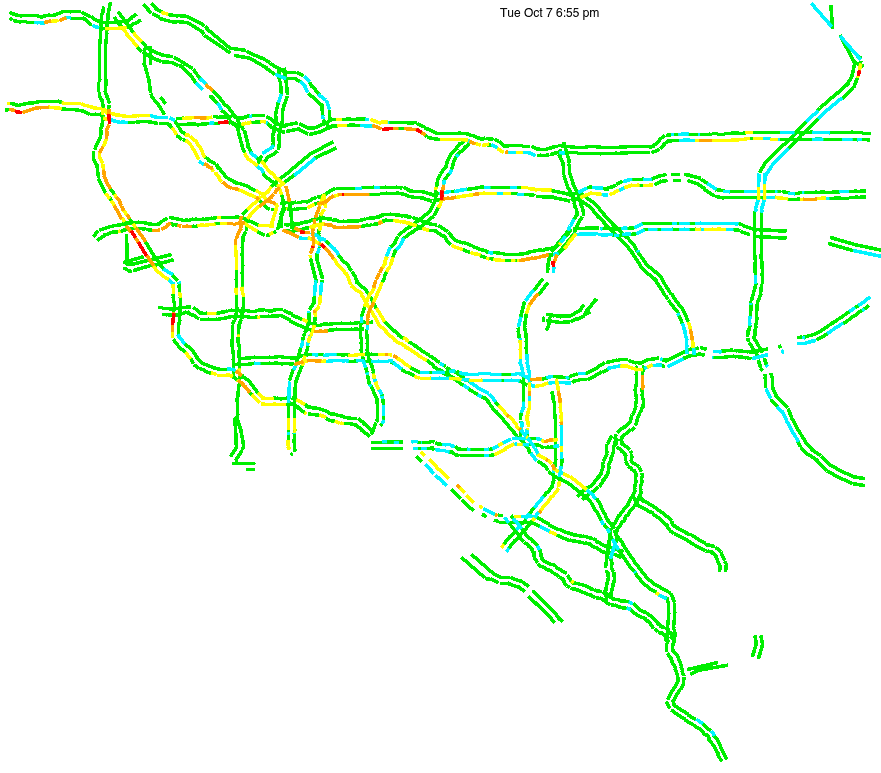 This is a map of historical traffic over 1 hour of time. The colored lines represent speed.