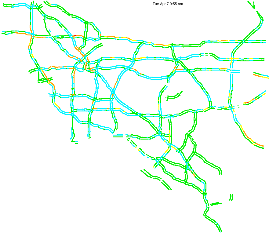 This is a map of historical traffic over 1 hour of time. The colored lines represent speed.