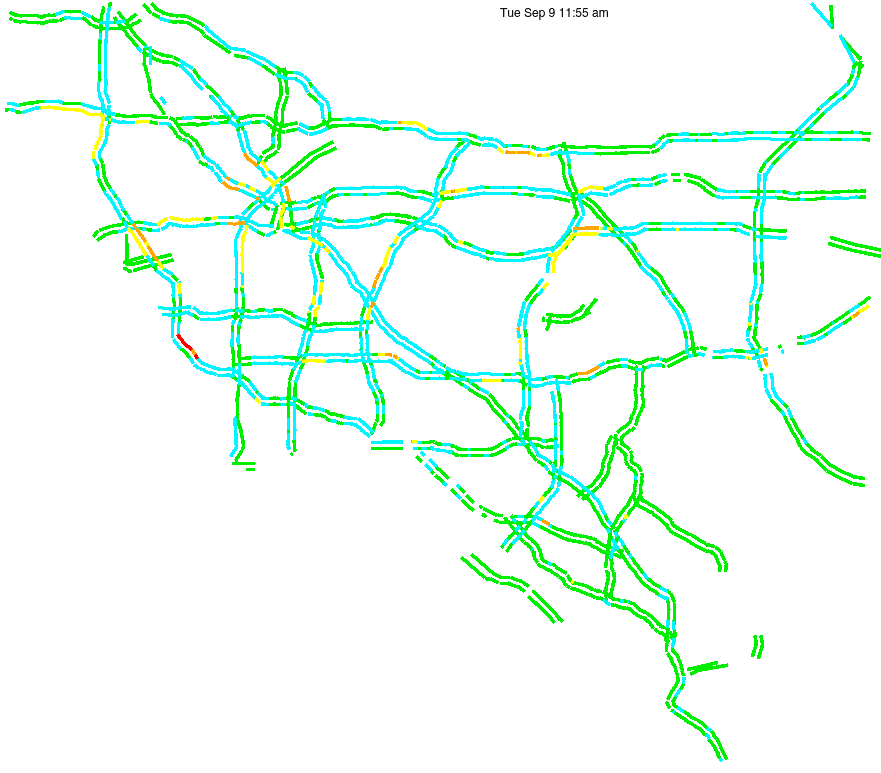 This is a map of historical traffic over 1 hour of time. The colored lines represent speed.