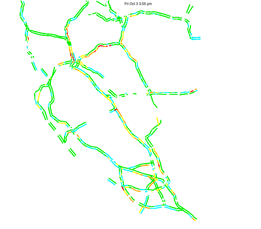 This is a map of historical traffic over 1 hour of time. The colored lines represent speed.