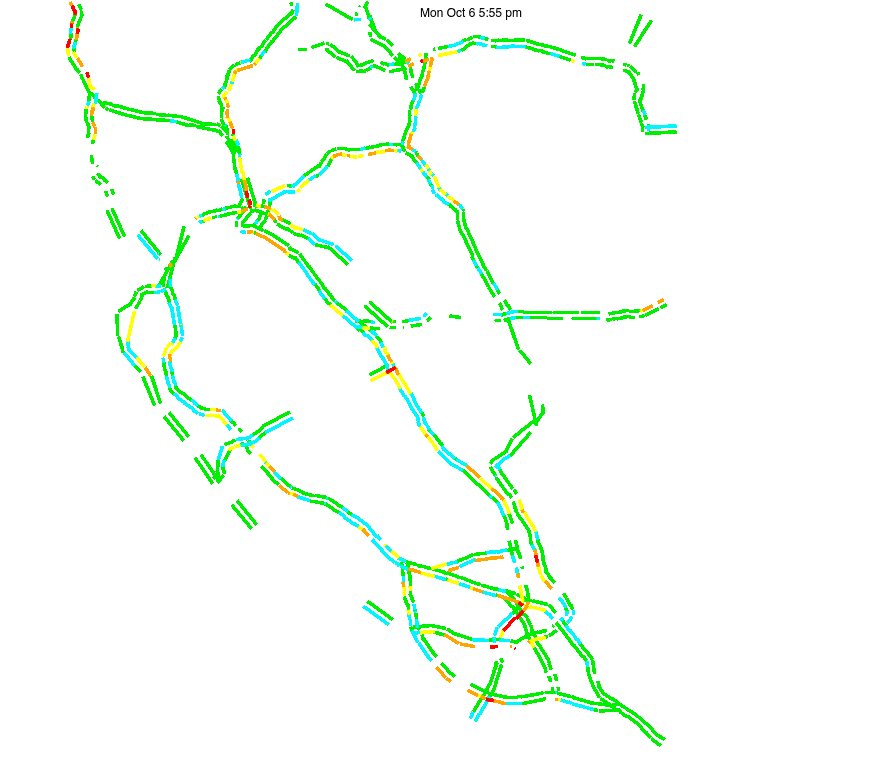 This is a map of historical traffic over 1 hour of time. The colored lines represent speed.