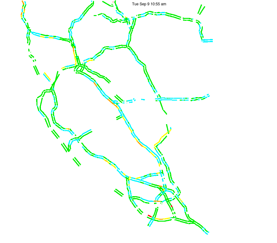This is a map of historical traffic over 1 hour of time. The colored lines represent speed.