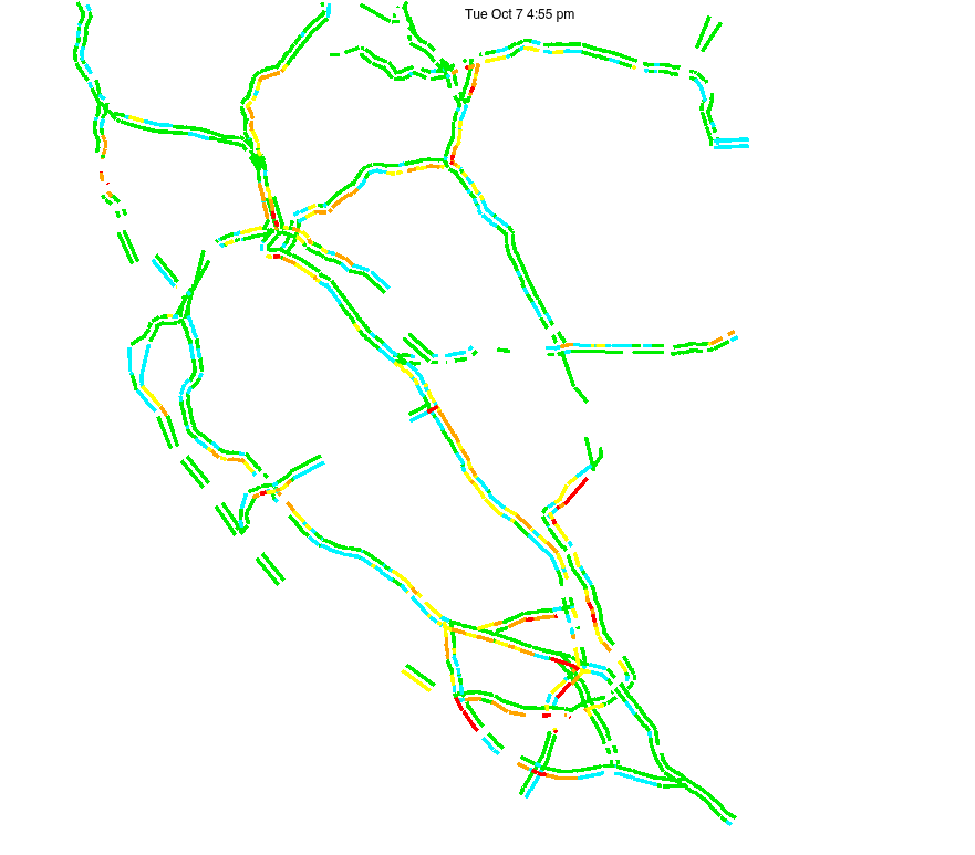 This is a map of historical traffic over 1 hour of time. The colored lines represent speed.
