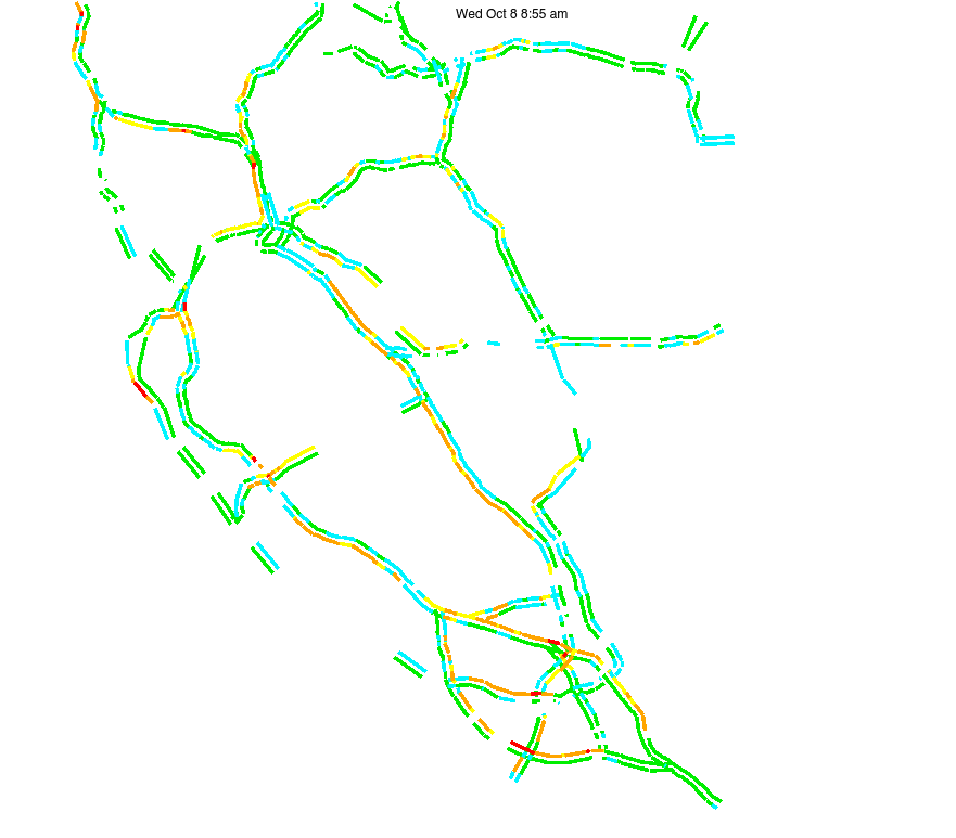 This is a map of historical traffic over 1 hour of time. The colored lines represent speed.