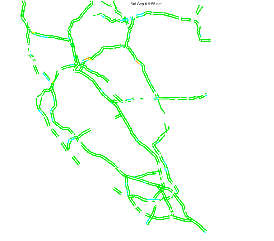 This is a map of historical traffic over 1 hour of time. The colored lines represent speed.