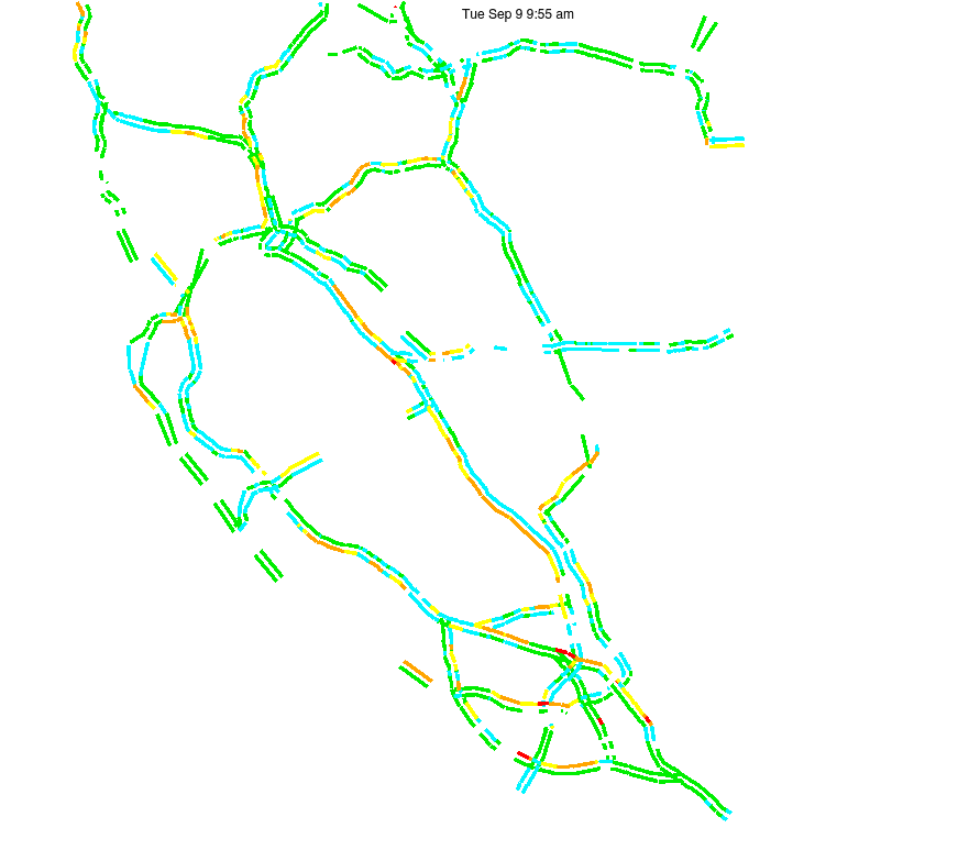 This is a map of historical traffic over 1 hour of time. The colored lines represent speed.